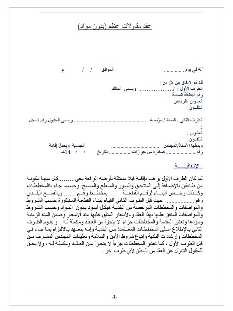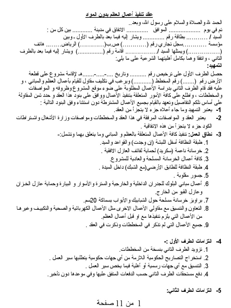 عقد مقاولة صيغة عقد بناء عظم بدون مواد Pdf
