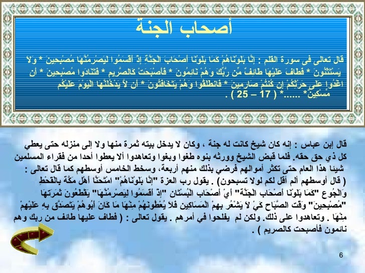 ضرب الله مثلا في سورة القلم لأصحاب الجنة أرجع لتفسير ابن كثير وأنقل منه أحداث القصة وأقرؤها على زملائي في الفصل المكتبة التعليمية