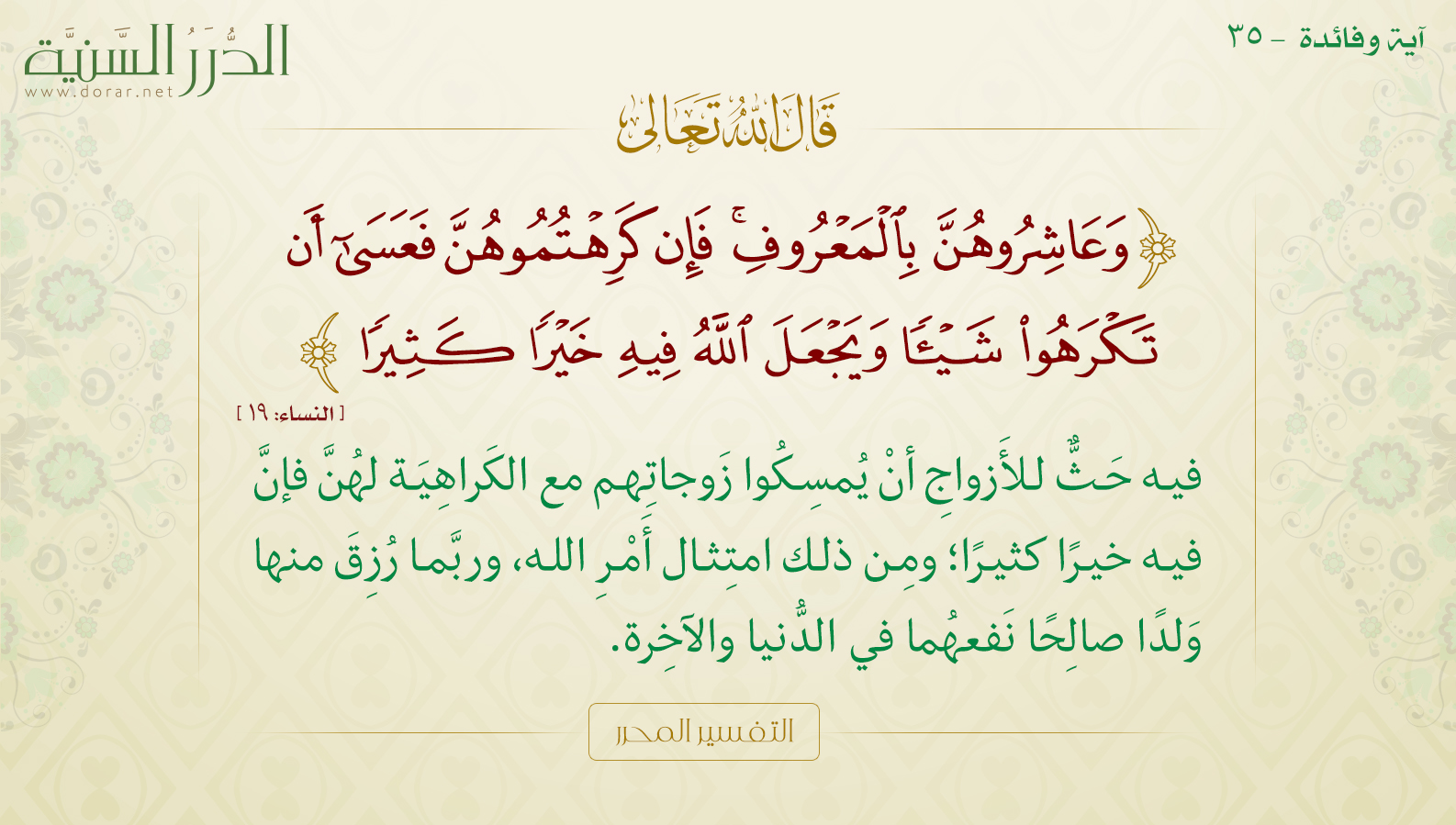 عسى ان تكرهوا شيئا ويجعل الله فيه خيرا كثيرا. فعسى أن يكون صبركم مع إمساككم لهن وكراهتهن فيه خير كثير لكم في الدنيا والآخرة. وعسى ان تكرهوا شيئا ويجعل الله فيه خيرا كثيرا هذه الآية تتكرر علينا بشكل مستمر طوال حياتنا وبالأخص عندما يتمنى الإنسان أحد الأشياء ولكن لا يعطيها الله له ومن المؤكد بأن الله هو المعطي وإليه يرجع كل شئ لذلك عندما. القول في تأويل قوله فإن كرهتموهن فعسى أن تكرهوا شيئا ويجعل الله فيه خيرا كثيرا 19 قال أبو جعفر يعني بذلك تعالى ذكره لا تعضلوا نساءكم لتذهبوا ببعض ما آتيتموهن من غير ريبة ولا نشوز كان منهن ولكن عاشروهن بالمعروف وإن. ف إ ن ك ر ه ت م وه ن ف ع س ى أ ن ت ك ر ه وا ش ي ئ ا و ي ج ع ل الل ه ف يه خ ي ر ا ك ث ير ا النساء 19.