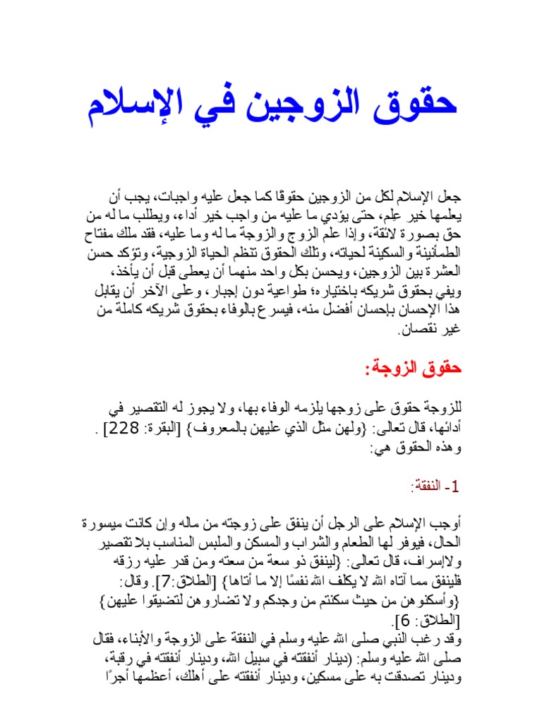 حقوق الزوجين في الشريعة الإسلامية