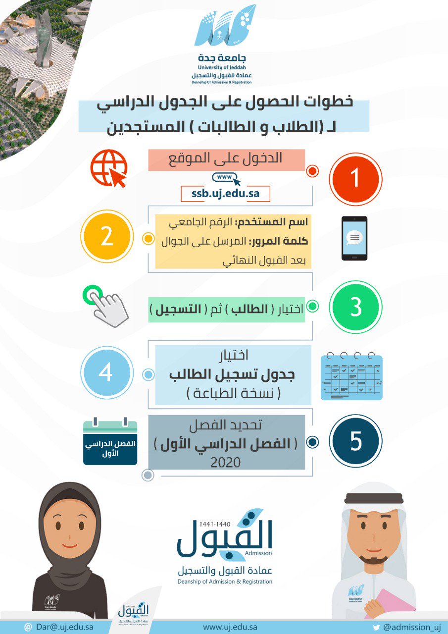 عمادةالقبول والتسجيل No Twitter تبارك عمادة القبول والتسجيل لجميع الطلاب والطالبات المقبولين نهائيا بجامعة جدة بإمكانكم الان الاطلاع على جداولكم الدراسية من خلال Ssb Uj Edu Sa واتباع الخطوات التالية جامعة جدة الاختيار الاول لقادة المستقبل