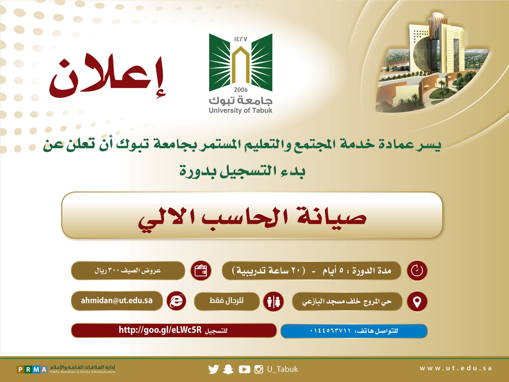 جامعة تبوك On Twitter إعلان تعلن عمادة خدمة المجتمع والتعليم المستمر عن بدء التسجيل بدورة صيانة الحاسب الالي وذلك عبر الرابط التالي Https T Co Ejlh15vriz جامعة تبوك دورة U Tabuk Https T Co Kar1x1xc9s
