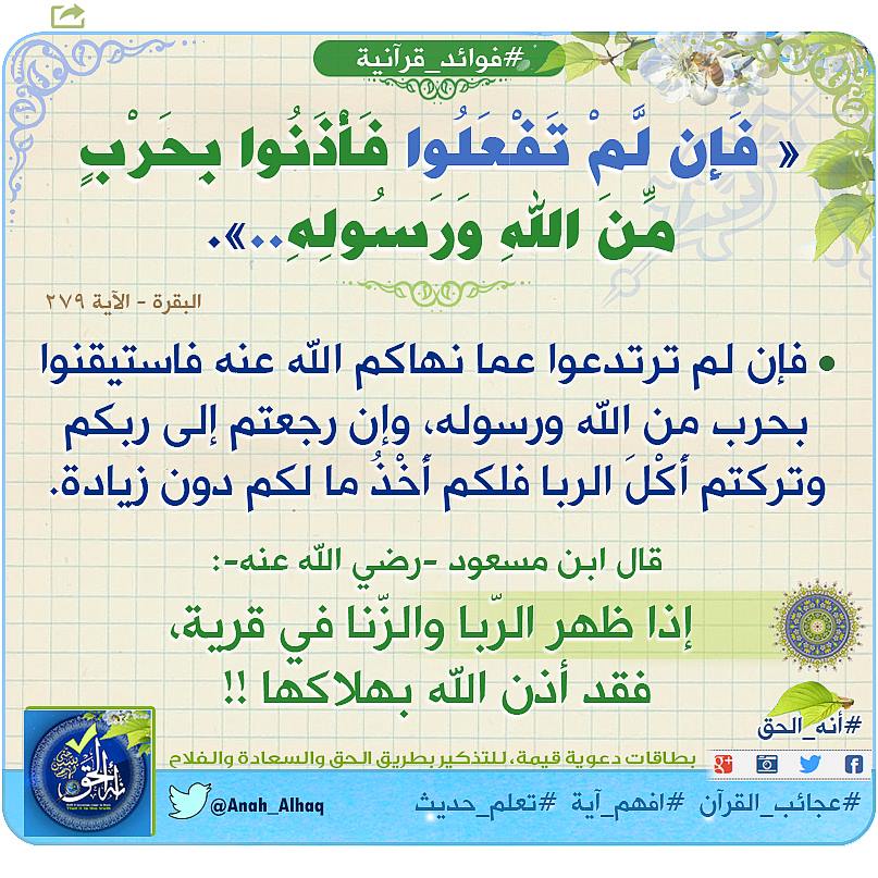 دين الحق On Twitter فإن لم تفعلوا فأذنوا بحرب من الله ورسوله تدبر أنه الحق إذا ظهر الربا والزنا في قرية فقد أذن الله بهلاكها Http T Co 1cupivf28t