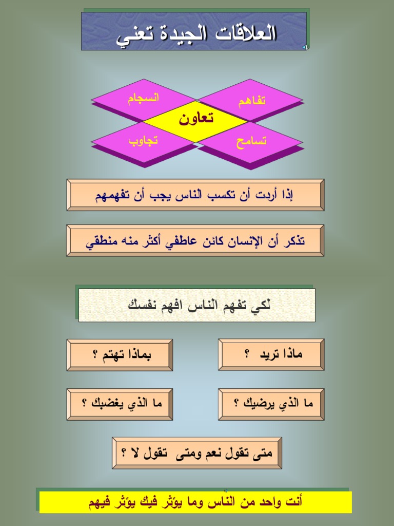 مهارات التعامل مع الآخرين بذكاء. فن التعامل مع الناس والتأثر فيهم ppt by hithamg6152 in book excerpts and فن التعامل مع الناس والتأثر فيهم ppt. دورة فن التعامل مع الجمهور د. التعامل مع الجمهور مهارة لا يمتلكها كثير من الناس فالخطوة الأولي لنجاح تعاملك مع جمهورك المتلقي هي دراسة طرق وأساليب الإتصال لتحقيق هدفك الإتصالي ولمزيد من المعلومات حول فن التعامل مع الجمهور تابع معنا المقال التالي.