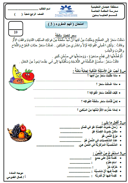 نموذج امتحان 3 فهم المقروء لمادة اللغة العربية للصف الرابع الفصل الثالث منتديات صقر الجنوب