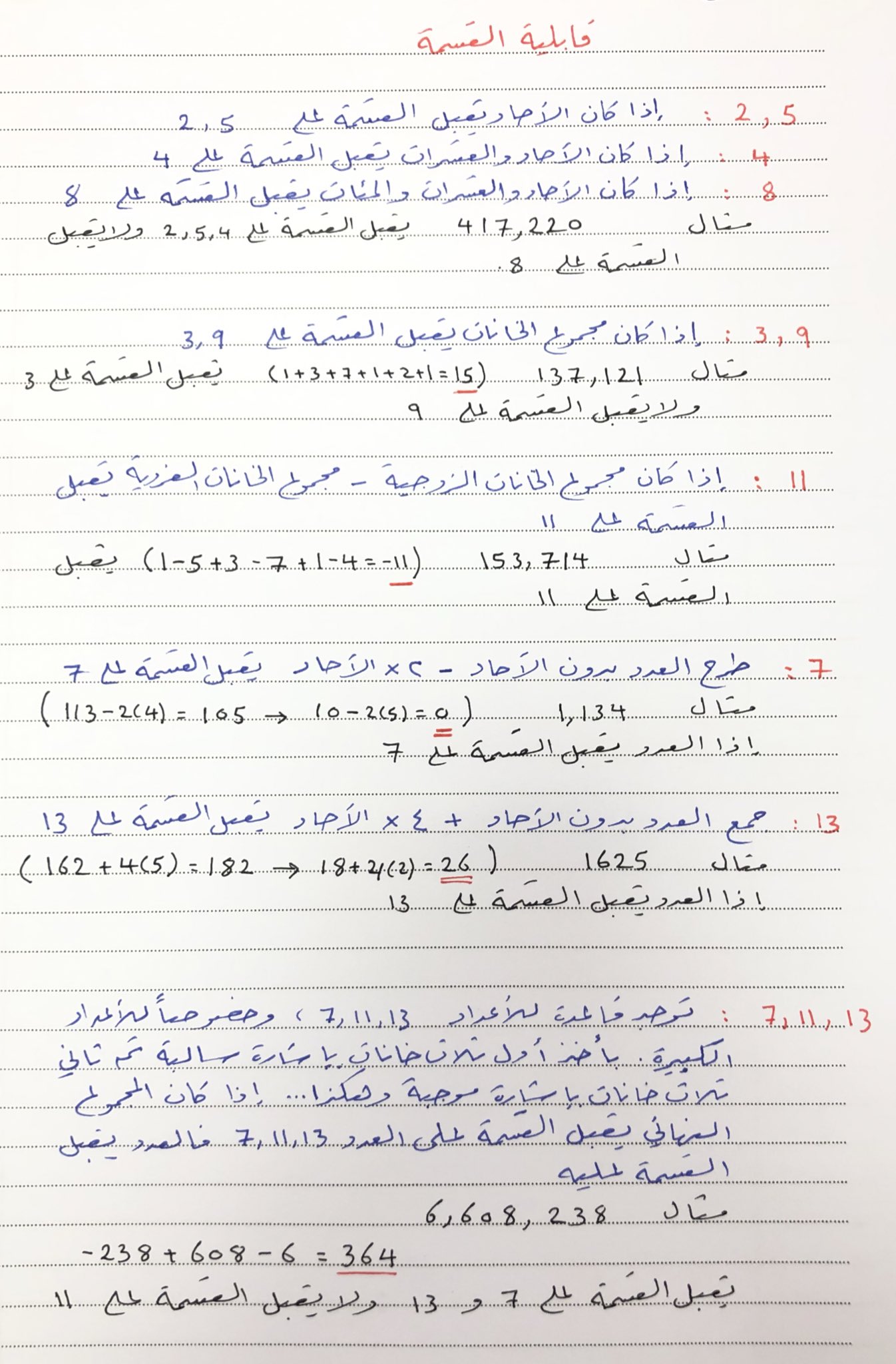 قابلية القسمة على 4و9و7و3والعدد8والعدد11و18و6و5و25و قابلية القسمة على اي عدد المقرر لكم الشامل