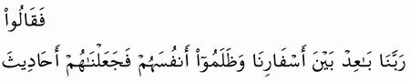 القران الكريم ف ق ال وا ر ب ن ا ب اع د ب ي ن أ س ف ار ن ا و ظ ل م وا أ ن ف س ه م ف ج ع ل ن اه م أ ح اد يث و م ز ق ن اه م ك ل م م ز ق إ ن ف ي ذ ل ك ل آي ات ل ك ل ص ب ار ش ك ور