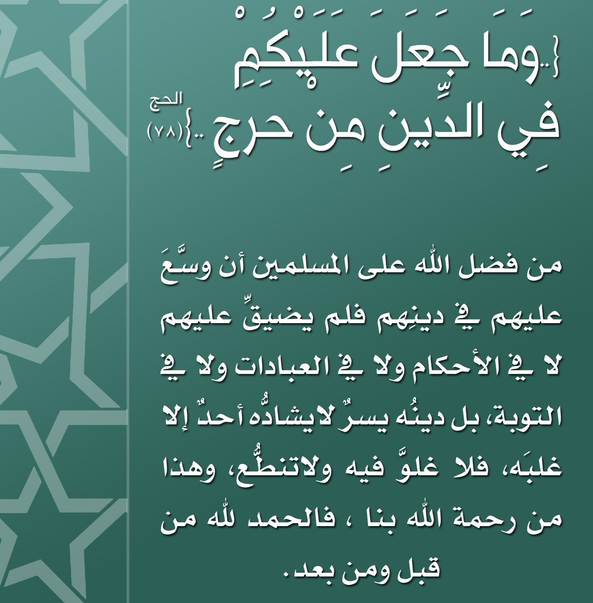 ابحث في تفسير الشيخ عبد الرحمن بن سعدي رحمه الله عن القاعدتين الشرعيتين اللتين استنبطهما العلماء من قوله تعالى وما جعل عليكم في الدين من حرج المكتبة التعليمية