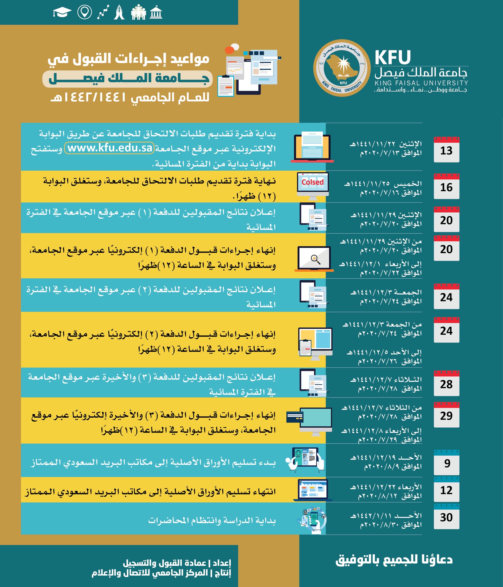 جامعة الملك فيصل On Twitter جامعة الملك فيصل تعلن مواعيد إجراءات القبول للعام الجامعي 1441 1442هـ دعاؤنا للجميع بالتوفيق