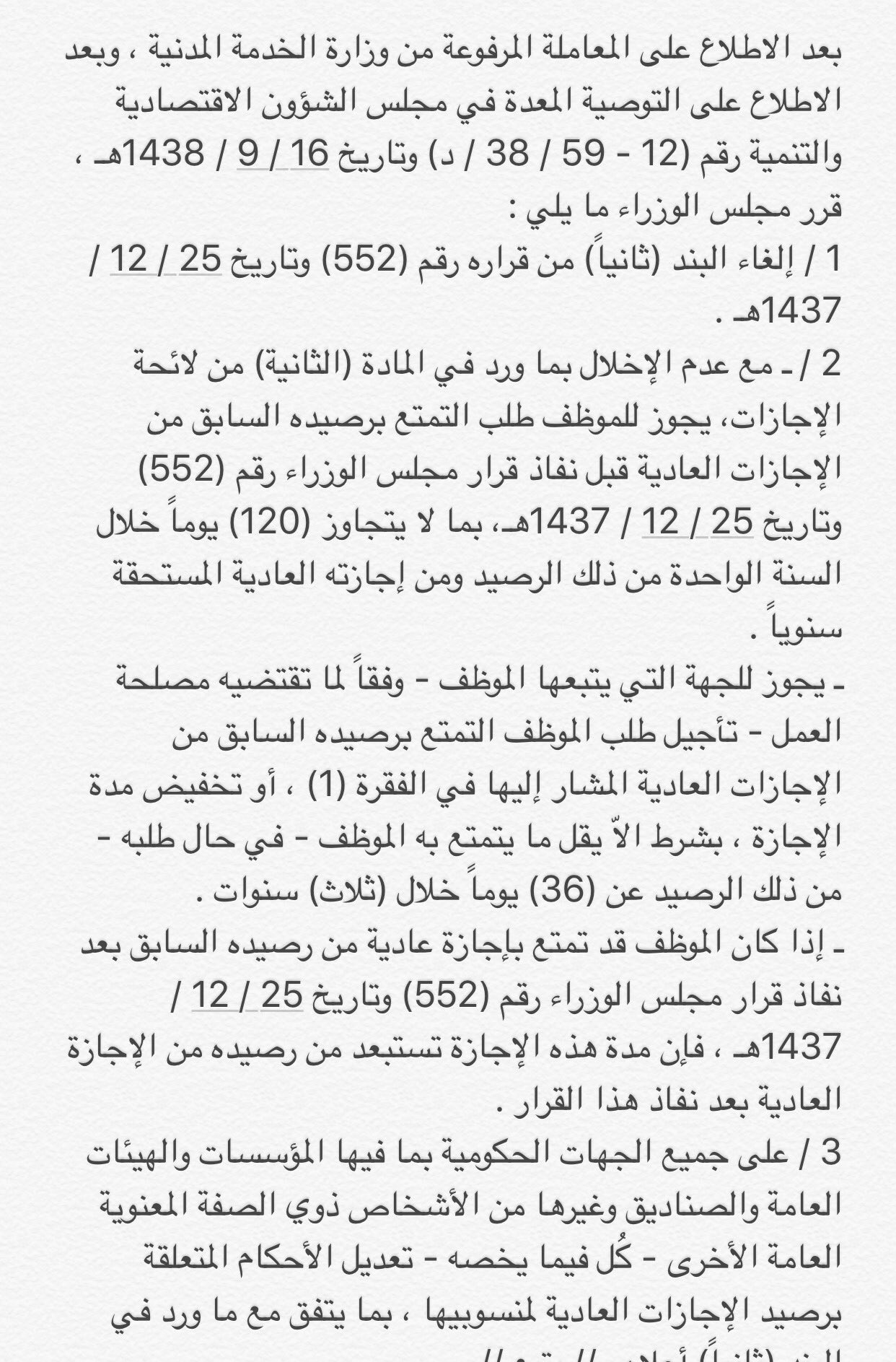 قرار مجلس الوزراء رقم 552. إلغاء البند خامسا من قرار مجلس الوزراء رقم 552 وتاريخ 25 12 1437هـ والعمل بالأحكام السابقة لما ورد في ذلك القرار. إن مجلس الوزراء بعد الاطلاع على المعاملة الواردة من الديوان الملكي برقم 37704 وتاريخ 29 7 1439هـ المشتملة على برقية معالي وزير الإسكان رقم 12417 وتاريخ 9 7 1439هـ في شأن إفادة الوزارة حيال تنفيذ قرار مجلس الوزراء رقم 405 وتاريخ. 2 مع عدم الإخلال بما ورد في المادة الثانية من لائحة الإجازات يجوز للموظف طلب التمتع برصيده السابق من الإجازات العادية قبل نفاذ قرار مجلس الوزراء رقم 552 وتاريخ 25 12 1437هـ بما لا يتجاوز 120 يوما خلال السنة الواحدة من. نشرت الجريدة الرسمية في عددها 49 مكرر 6 قرارات لرئيس مجلس الوزراء الدكتور مصطفى مدبولي.